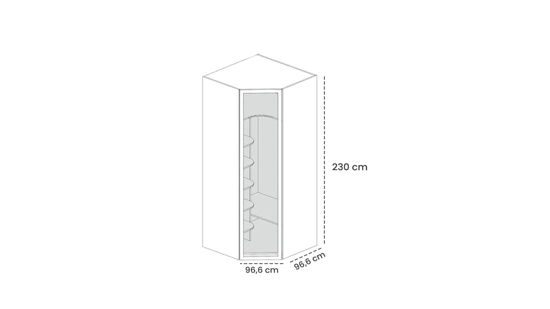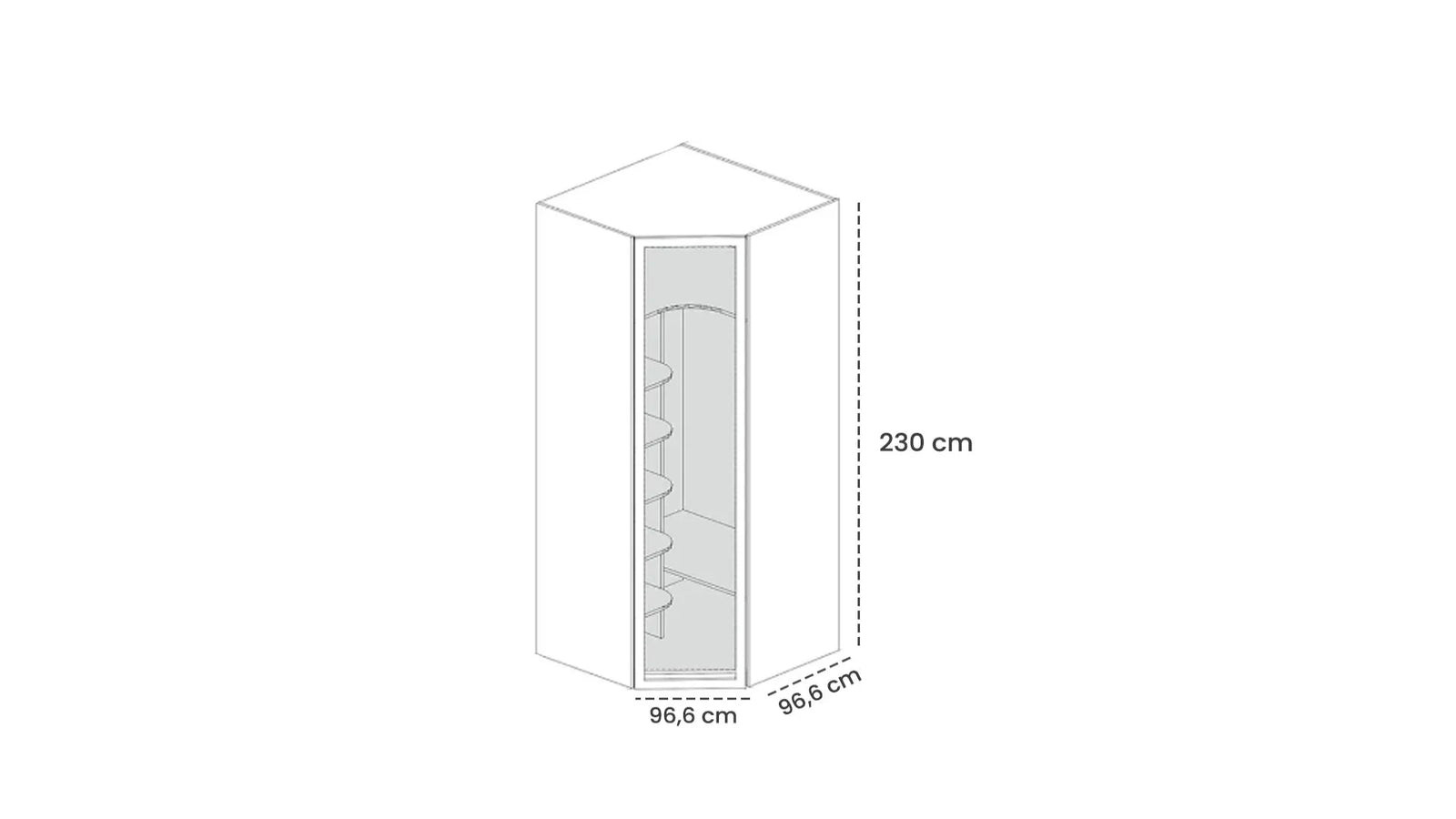 Dulapul de colț Bergamo transformă orice colț al dormitorului într-un spațiu de depozitare valoros. Finisajul din sticlă vitrata adaugă un plus de eleganță, în timp ce interiorul bine compartimentat oferă soluții versatile pentru depozitarea hainelor, accesoriilor si lenjeriei.