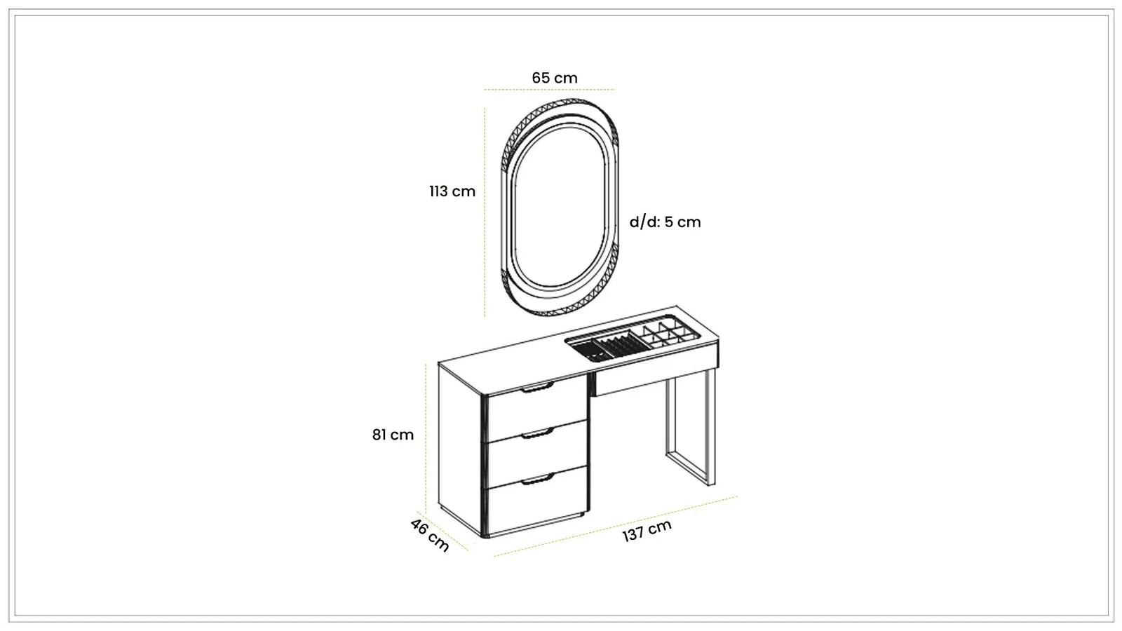 Dimensiuni masa de toaleta: L: 137cm x H:81cm x l: 46cm Dimensiuni oglinda: L: 65cm x H:113cm x W: 5cm