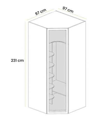 Dulapul de colț Ducale completează cu rafinament eleganța discretă a dormitorului tău si aduce un plus de confort prin designul său interior practic și bine organizat. Realizat cu un corp în nuanță gri deschis si disponibil cu usi din sticlă fumurie neagră cu ramă elegantă sau din MDF, acest dulap se remarcă prin stilul său modern și sofisticat. Interiorul inteligent compartimentat, cu 6 rafturi și spațiu dedicat pentru umerase, oferă soluții optime de depozitare, integrându-se perfect în colecția Ducale. Opțiunile de uși clasice sau tip acordeon îl fac versatil și adaptabil nevoilor tale.