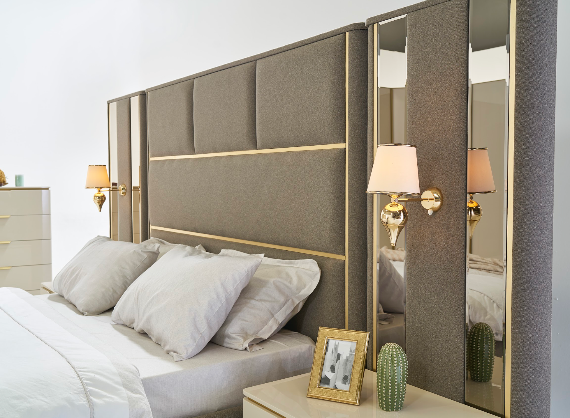 Panoul noptieră VEGAS este un element decorativ și funcțional care completează perfect tăblia patului din aceeași colecție. Îmbină material textil tapițat, benzi metalice aurii și oglindă verticală aplicată, adăugând profunzime și eleganță spațiului de dormit.